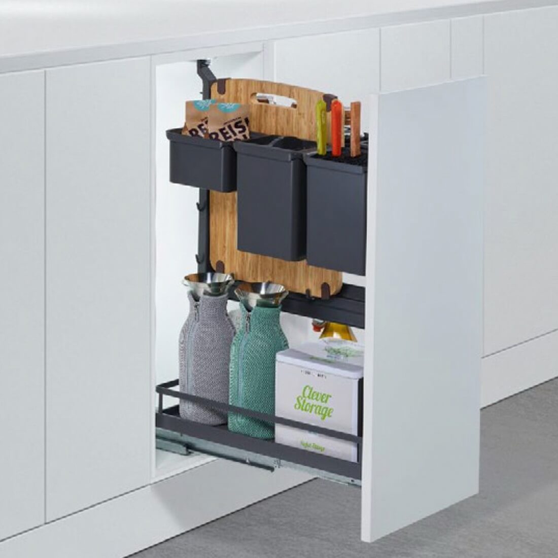 Контейнеры можно расположить в различном порядке. Для Вашего удобства рейка, на которой они располагаются, может перемещаться по высоте.