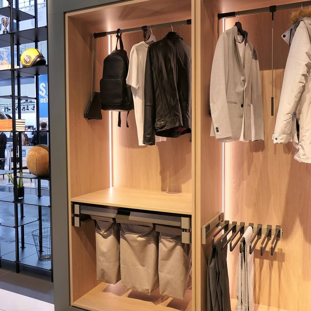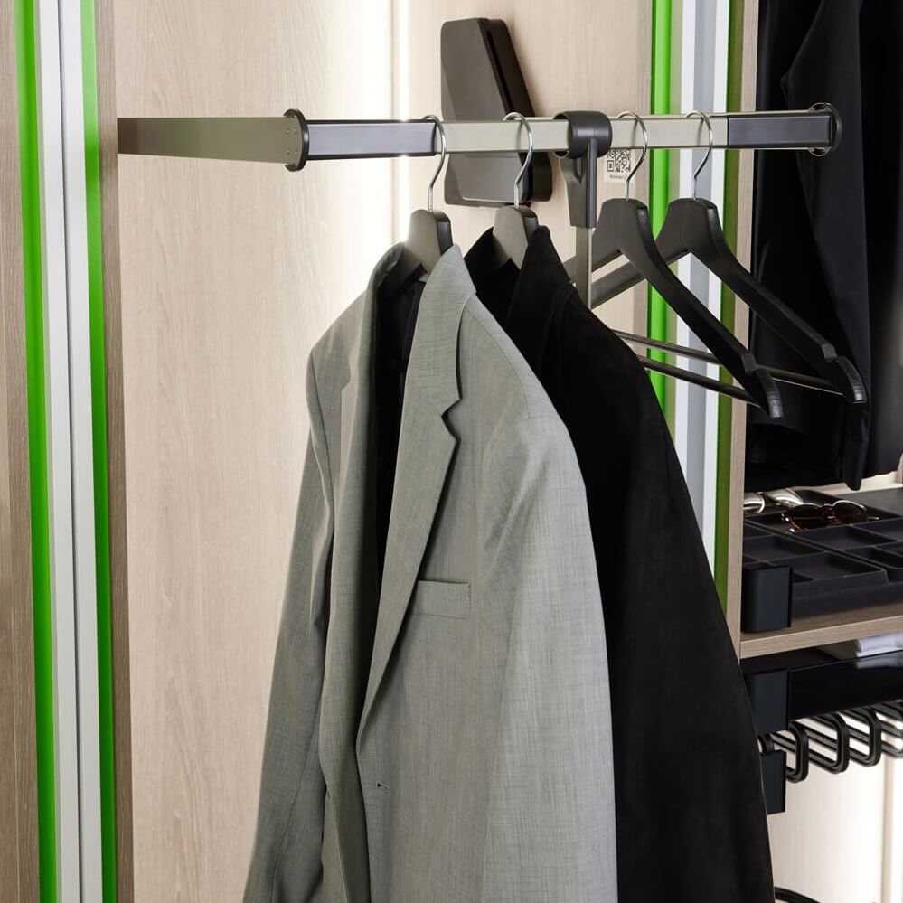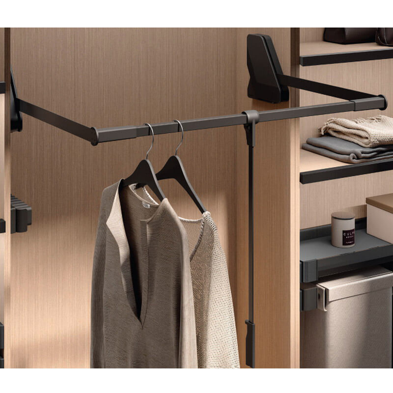 Пантограф для одежды Конеро позволяет использовать для хранения всю высоту гардеробной и при этом иметь к вещам оптимальный легкий доступ. За счет опускания штанги с одеждой достигается увеличение зоны хранения и удобства ее использования. Штанга комфортно движется как при минимальных, так и при полных нагрузках. Полезная нагрузка штанги 0,5-12 кг позволяет размещать не только легкие вещи, но и тяжелые куртки и пальто.