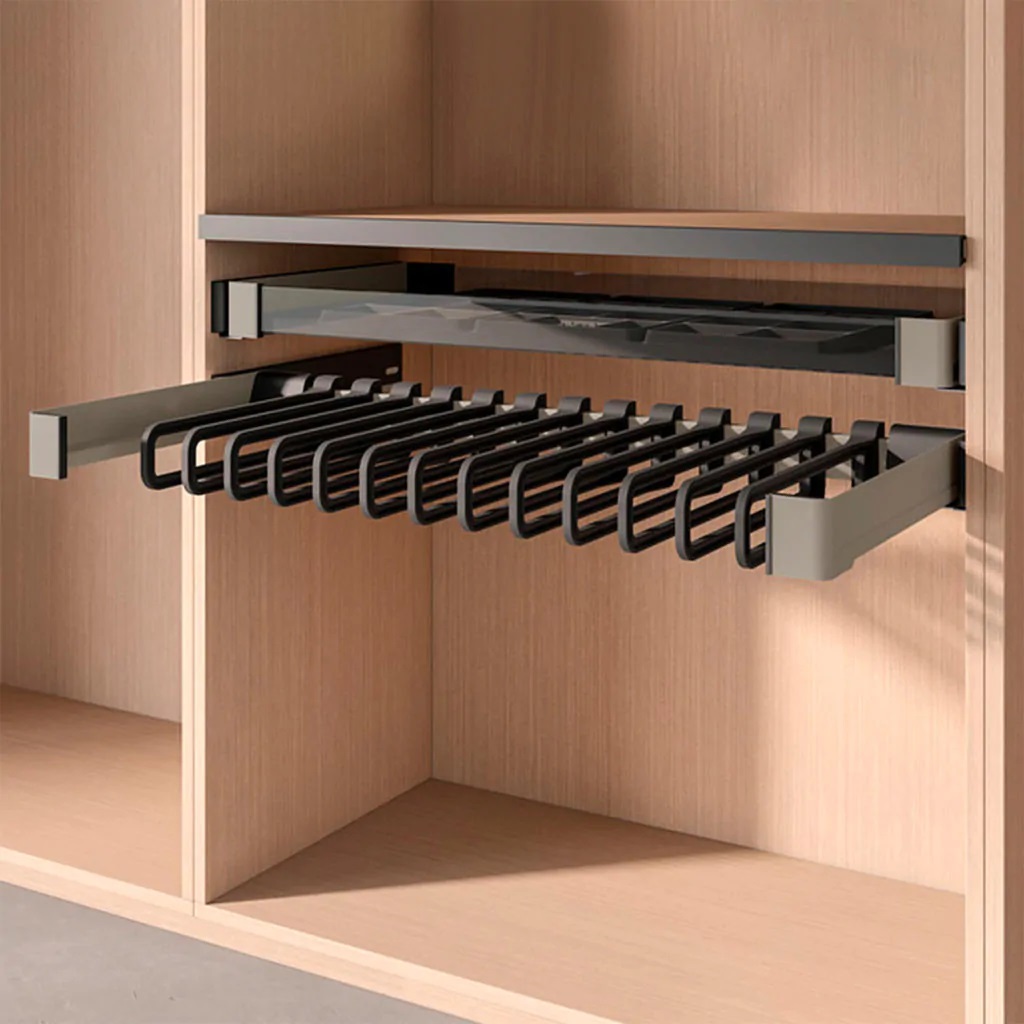 Создайте с помощью cистемы хранения Конеро — удобную функциональную гардеробную или шкаф купе. Используйте раму-держатель выдвижную Conero с вешалками для белья Конеро.