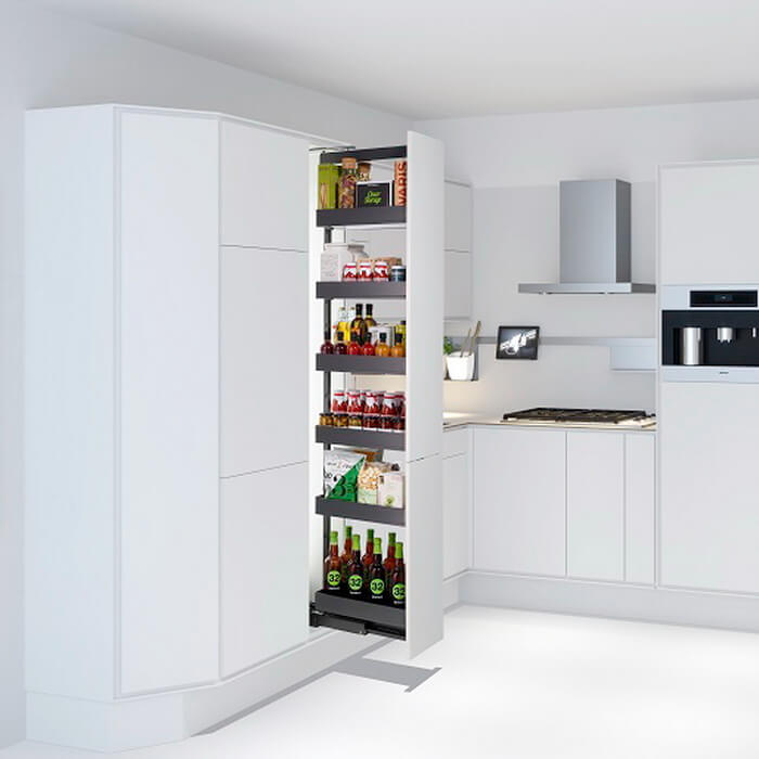 Диспенса 90° Высокая колонна на 4 полки для узких шкафов. Позволяет размещать максимальное количество продуктов на ограниченном пространстве. При выдвижении обеспечивается полный обзор с двух сторон.