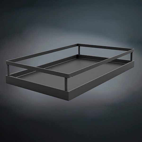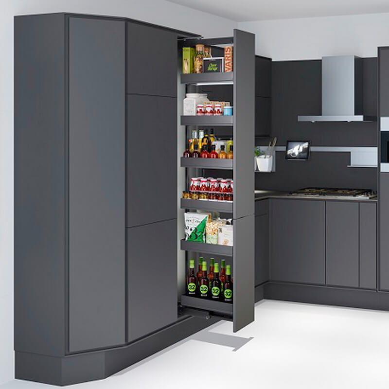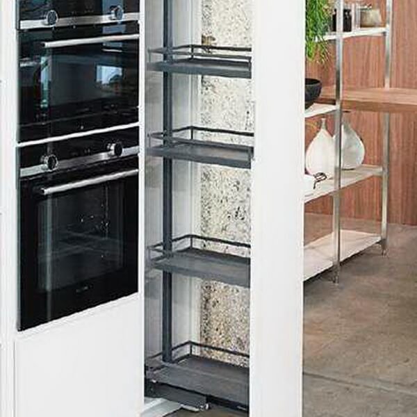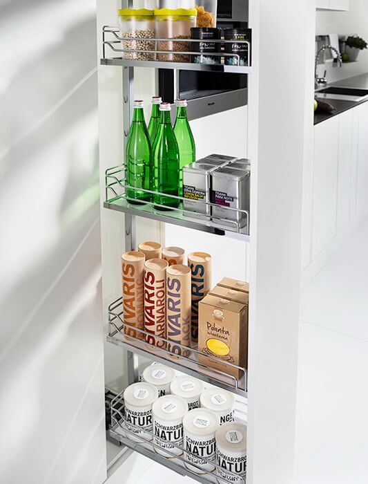 Диспенса 90° Высокая колонна на 4 полки для узких шкафов. Позволяет размещать максимальное количество продуктов на ограниченном пространстве. При выдвижении обеспечивается полный обзор с двух сторон.