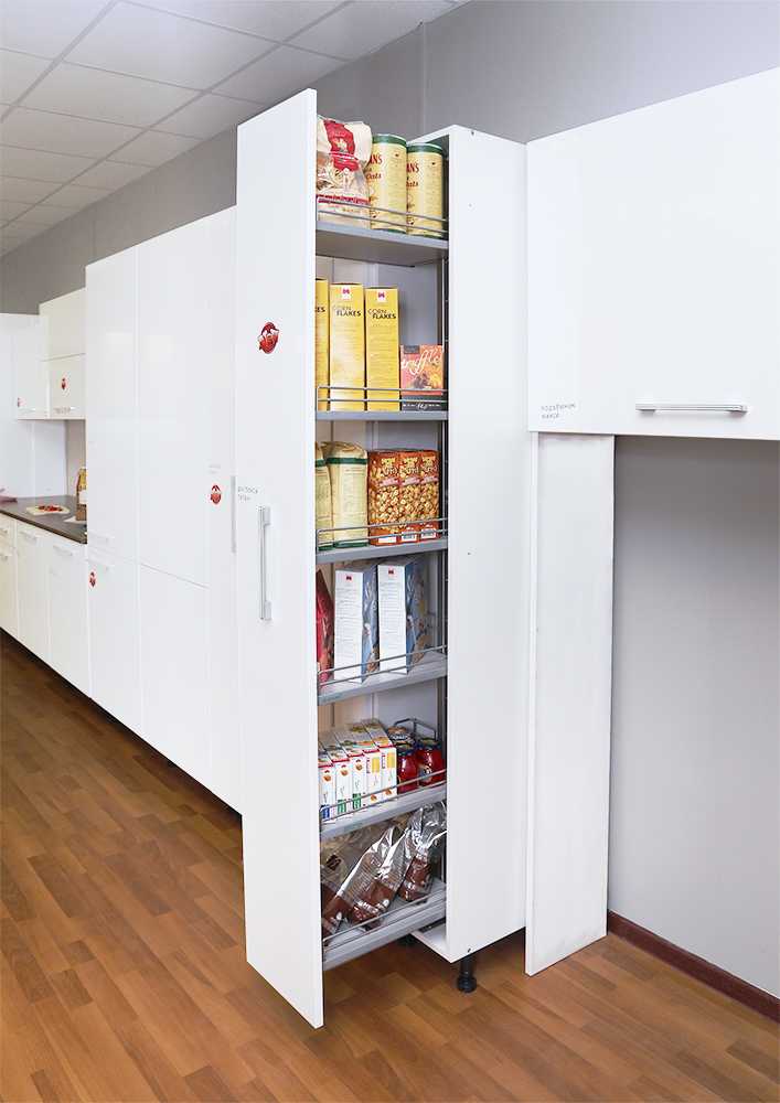 Данный механизм предназначен для узких шкафов-колонн и позволяет централизованно организовать хранение сухих продуктов. Все содержимое — макароны, крупы, сахар, специи различные банки, бутылки и коробки — хранится в одном месте и легким движением руки выдвигаются на передний план, в зону доступа и обзора.