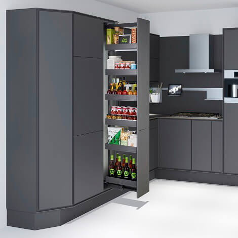 Данный механизм предназначен для узких шкафов-колонн и позволяет централизованно организовать хранение сухих продуктов. Все содержимое — макароны, крупы, сахар, специи различные банки, бутылки и коробки — хранится в одном месте и легким движением руки выдвигаются на передний план, в зону доступа и обзора.