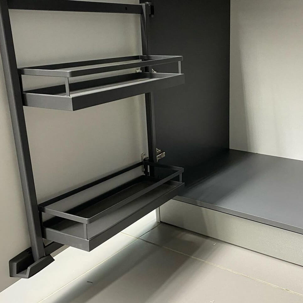 Расположение полок по высоте регулируется. Нагрузка на каждую полку механизма составляет до 4 кг. Особенность механизма Тандем Сайд заключается в том, что вес полок с содержимым переносится на корпус и не влияет на функционирование фасада и легкость его открывания. Открытие фасада получается плавным и легким.