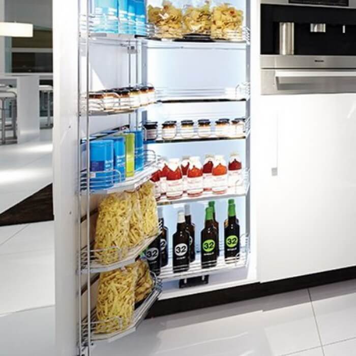 Полки имеют противоскользящее покрытие, что обеспечивает надёжное удержание продуктов и предотвращает их опрокидывание при открывании фасада.