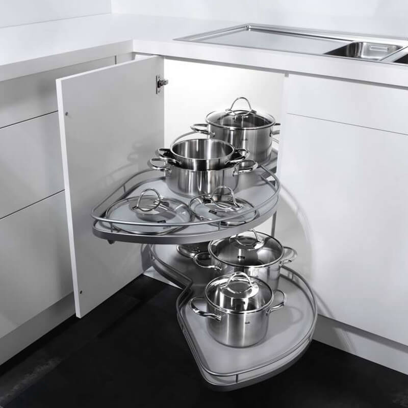 Комплект Леманс под фасад шириной 500 мм с двумя полками, правый, цвет Хром - уникальный механизм для прямых угловых тумб. Совершая поворотно-выдвижное движение он обеспечивает полное выдвижение полок из тумбы. В результате вы без усилий получаете полный и беспрепятственный доступ к содержимому полок.
