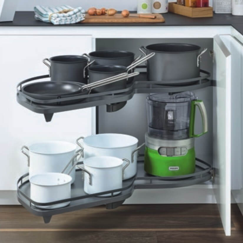 Леманс 450 с двумя полками, левый, цвет АНТРАЦИТ - уникальный механизм для прямых угловых тумб. Совершая поворотно-выдвижное движение он обеспечивает полное выдвижение полок из тумбы. В результате вы без усилий получаете полный и беспрепятственный доступ к содержимому.