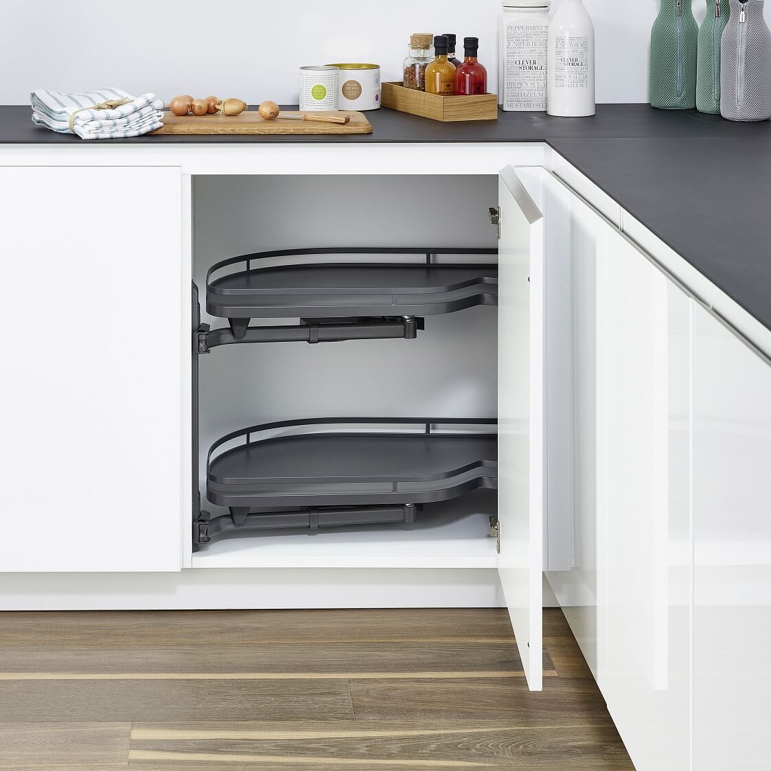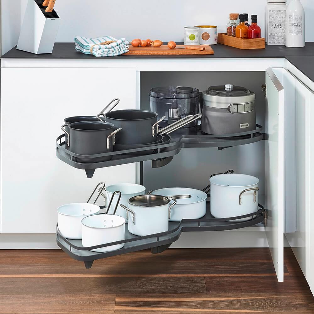 Леманс 400 с двумя полками, левый, цвет АНТРАЦИТ - уникальный механизм для прямых угловых тумб. Совершая поворотно-выдвижное движение он обеспечивает полное выдвижение полок из тумбы. В результате вы без усилий получаете полный и беспрепятственный доступ к содержимому.