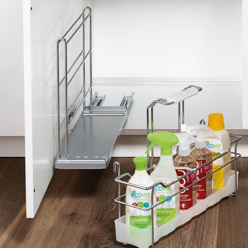 Контейнер "Портеро" для хозпренадлежностей оснащен одной выкатной съёмной ёмкостью с ручкой. Механизм оснащен системой Софт Стоп, обеспечивающей плавное задвигание в тумбу. Направляющие крепятся ко дну каркаса, что делает механизм универсальным. Габаритные размеры механизма Портеро: ширина 160 мм, глубина 468 мм, высота 395 мм. Дно выполнено из пластика стойкого к щелочам и кислотам. Нагрузка на механизм до 12 кг.