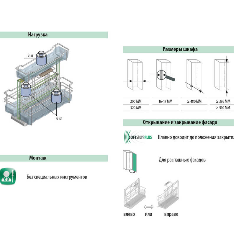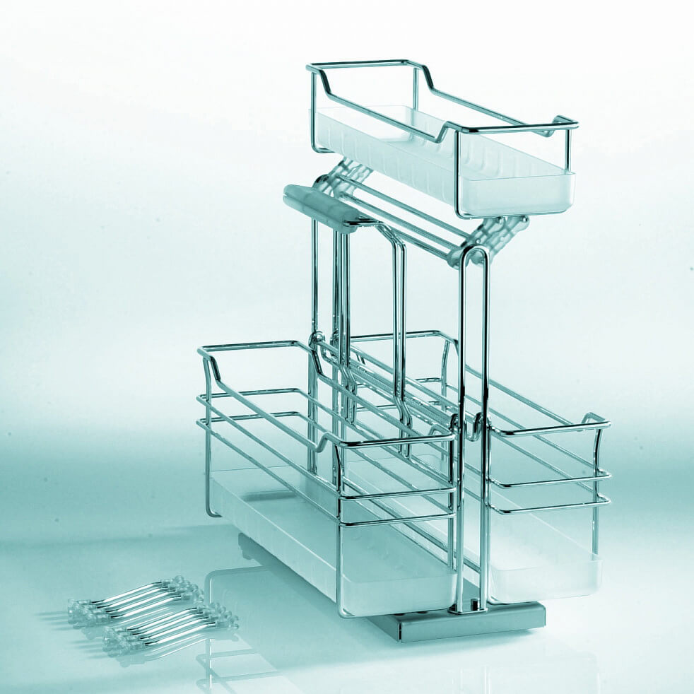 Контейнер "Портеро" для хозпренадлежностей оснащен тремя выкатными съёмными ёмкостями с ручками. Нижние корзины выполнены съёмными, а верхняя передвигается в стороны. Дно выполнено из пластика стойкого к щелочам и кислотам. Направляющие крепятся ко дну каркаса, что делает механизм универсальным. Габаритные размеры механизма Портеро составляют: ширина 276мм, глубина 468мм, высота 510мм. Механизм оснащен системой Софт Стоп, обеспечивающей плавное задвижение в тумбу.