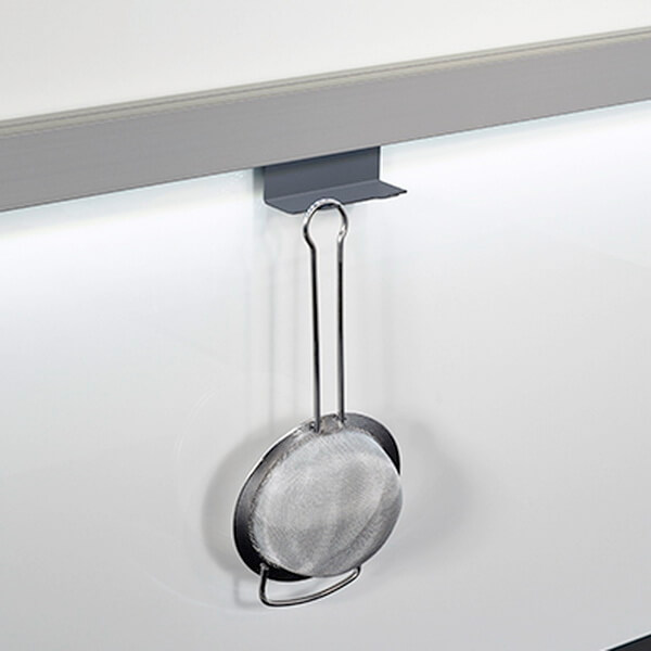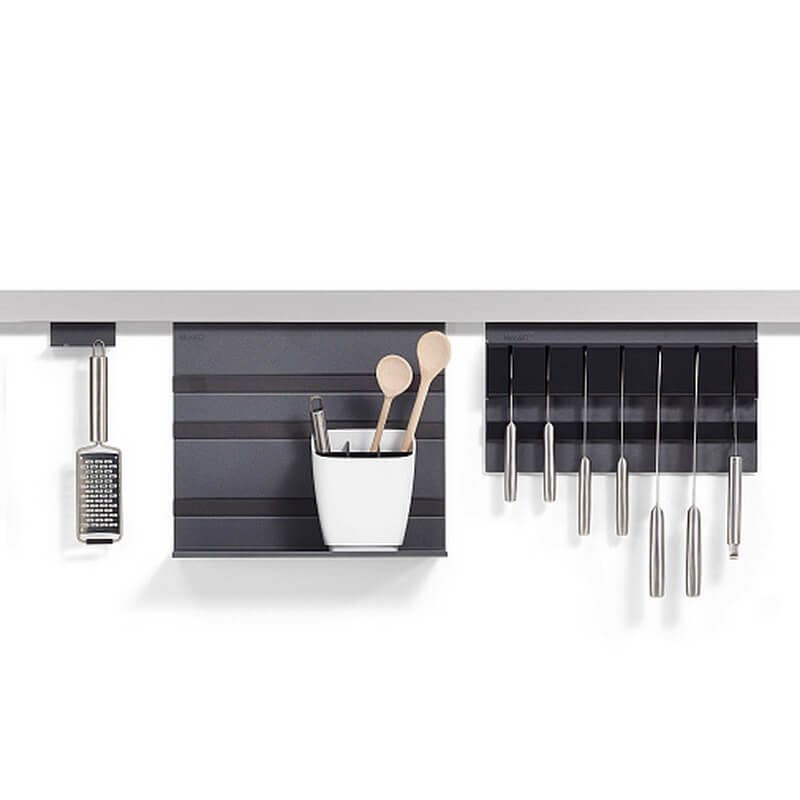 ЛинероМозаик 900 мм КОМПЛЕКТ №2 цвета АНТРАЦИТ - набор из рейлинга шириной 900 мм и четырех аксессуаров, которые на него устанавливаются. С их помощью вы с удобством сможете размещать над столешницей разнообразную кухонную утварь.