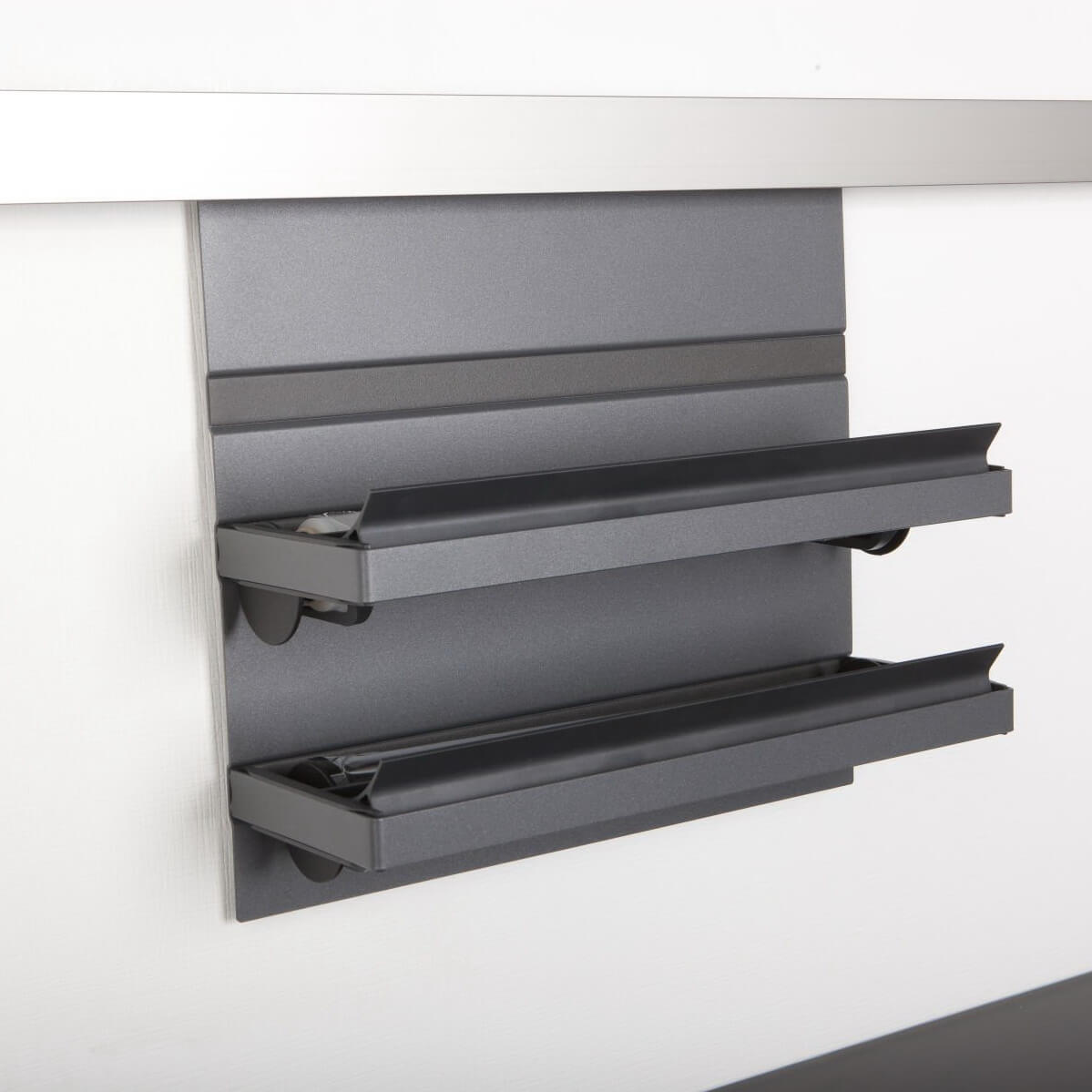 Держатель для пищевой пленки и фольги. Оборудован ножами, обеспечивающими максимальную легкость использования. Держатель устойчив к воздействию влаги и долго сохраняет отличный внешний вид. Держатель можно укомплектовать дополнительными навесными элементами, которые позволяют создавать индивидуальные композиции для каждого кухонного гарнитура. Покрытие - многослойное порошковое напыление.