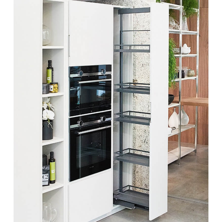 Диспенса 90° Высокая колонна на 5 полок для шкафов с шириной фасада 250 мм. Позволяет размещать максимальное количество продуктов на ограниченном пространстве. При выдвижении обеспечивается полный обзор с двух сторон.