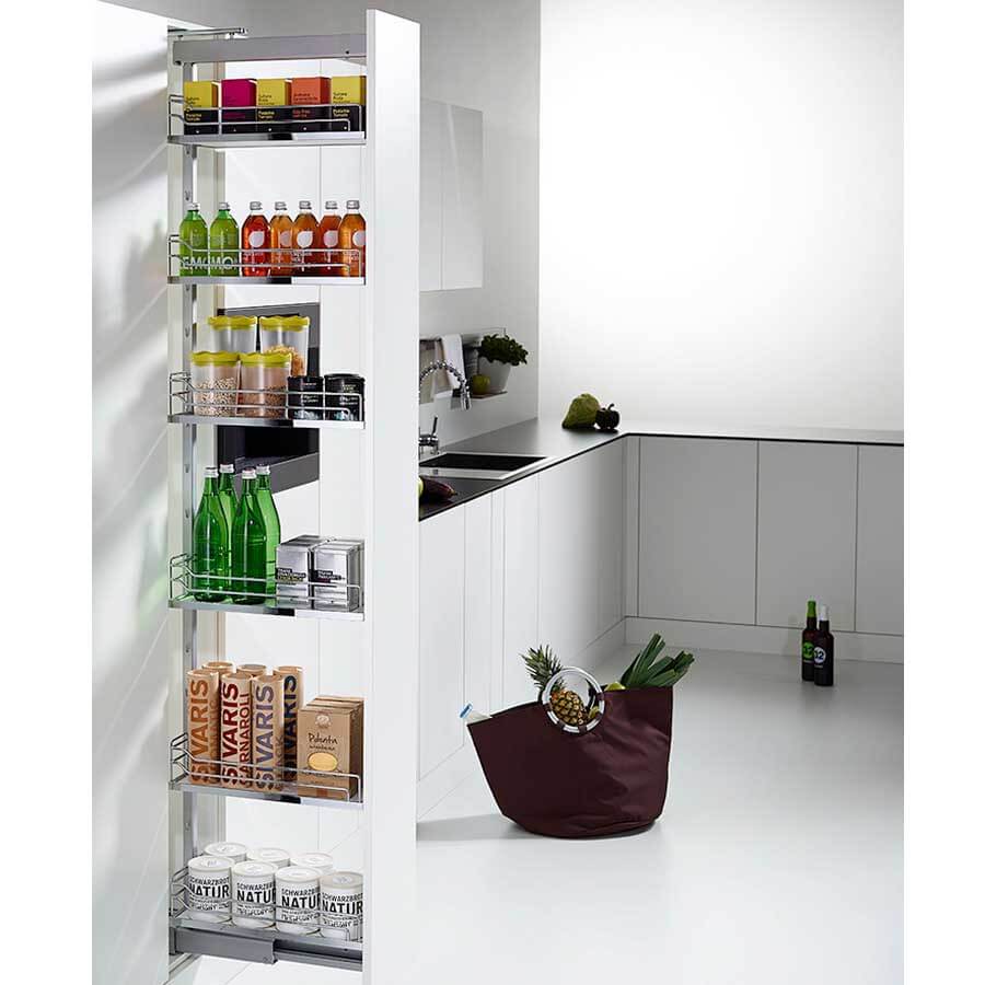 Диспенса 90° Высокая колонна на 6 полок для шкафов с шириной фасада 250 мм. Позволяет размещать максимальное количество продуктов на ограниченном пространстве. При выдвижении обеспечивается полный обзор с двух сторон.