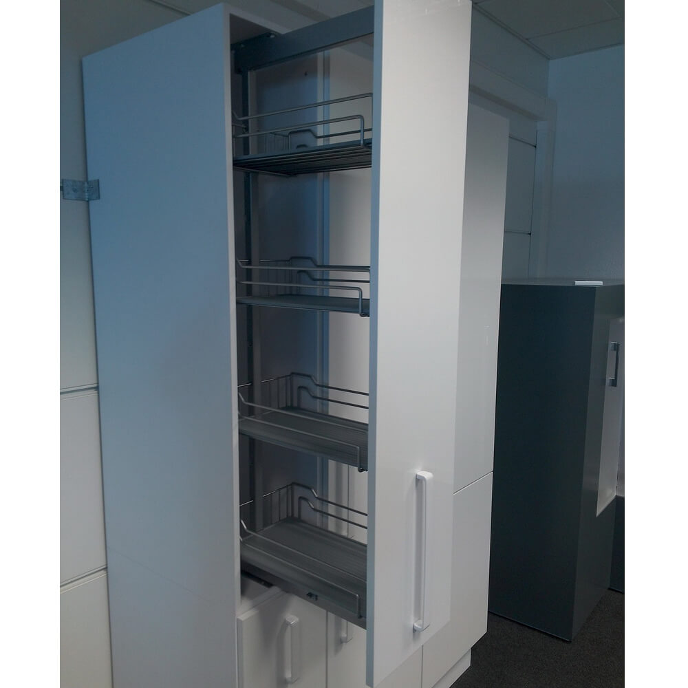 Диспенса 90° Высокая колонна на 4 полки для узких шкафов. Позволяет размещать максимальное количество продуктов на ограниченном пространстве. При выдвижении обеспечивается полный обзор с двух сторон.