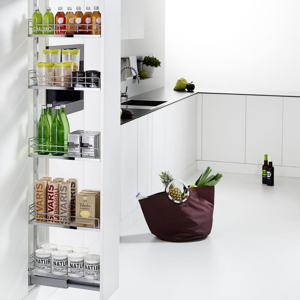 Диспенса 90° Высокая колонна на 5 полок для узких шкафов. Позволяет размещать максимальное количество продуктов на ограниченном пространстве. При выдвижении обеспечивается полный обзор с двух сторон.