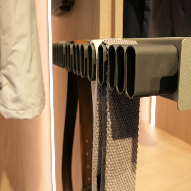 Держатель для галстуков и ремней выдвижной 450 мм Conero (Конеро) входит в систему хранения Конеро. Это комплексное решение для создания функциональных гардеробных и шкафов купе. В системе хранения Конеро представлены: полки, пантографы, штанги, брючницы, держатели для ремней, галстуков и ящички для хранения ювелирных изделий.