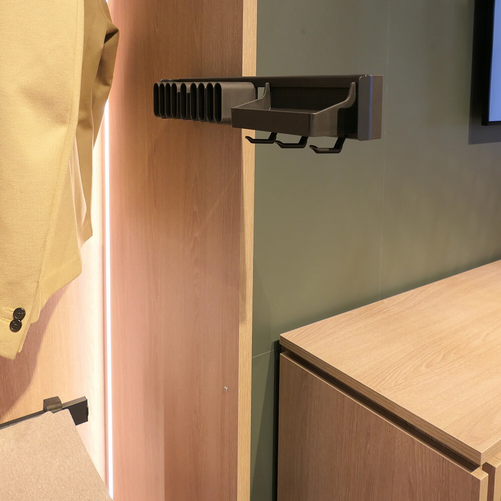 Держатель с полочкой обладает весьма компактным размером, его можно с удобством разместить под вешалками для одежды на боковой поверхности гардероба.