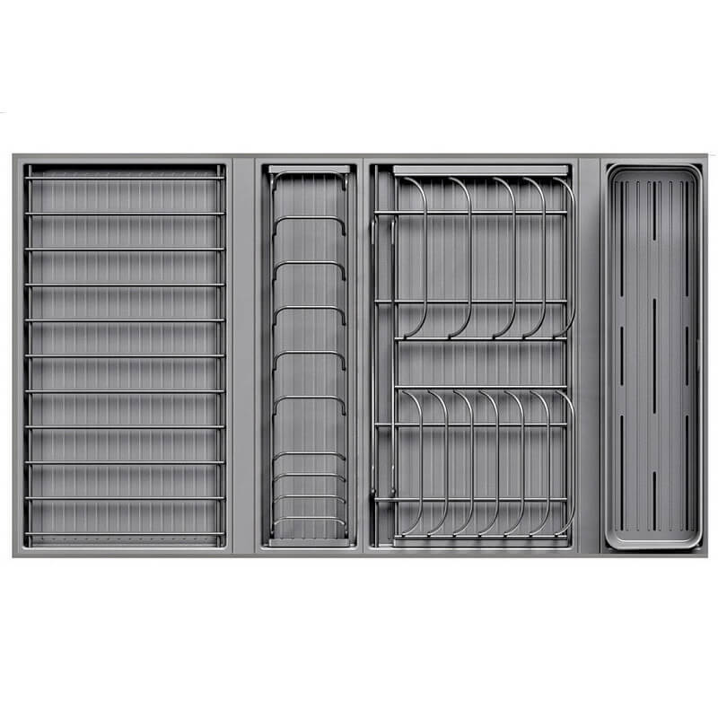 Сушка выдвижная И1234, Дайнинг Агент 900 мм включает в себя раму с передним бортиком на которой выдвигается четыре модуля: 1 для посуды большой, 1 для посуды малый, 1 для столовых приборов, 1 с решеткой большой. Цвет решеток - Антрацит. Цвет поддонов - Антрацит.