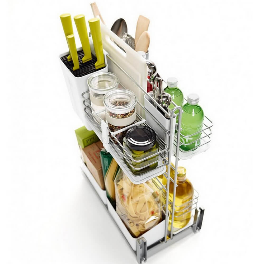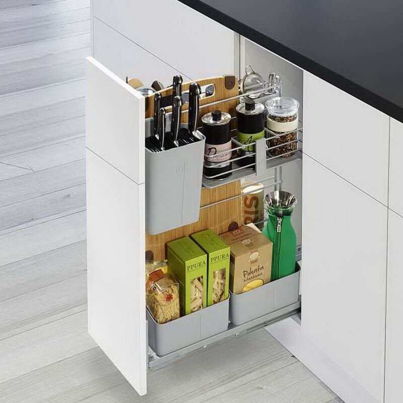 Кукинг Агент используется для тумб с шириной фасада 300 мм. Механизм обеспечивает полное выдвижение с функцией плавного закрытия Soft-Stop. Легкий и быстрый монтаж механизма без инструментов. 8 съёмных ёмкостей можно легко отрегулировать по высоте и подстроить механизм под себя. Есть отверстия для испарения воды и «проветривания» предметов. Высокое качество, подтверждено международными сертификатами..
