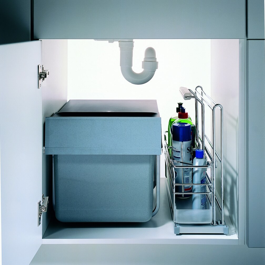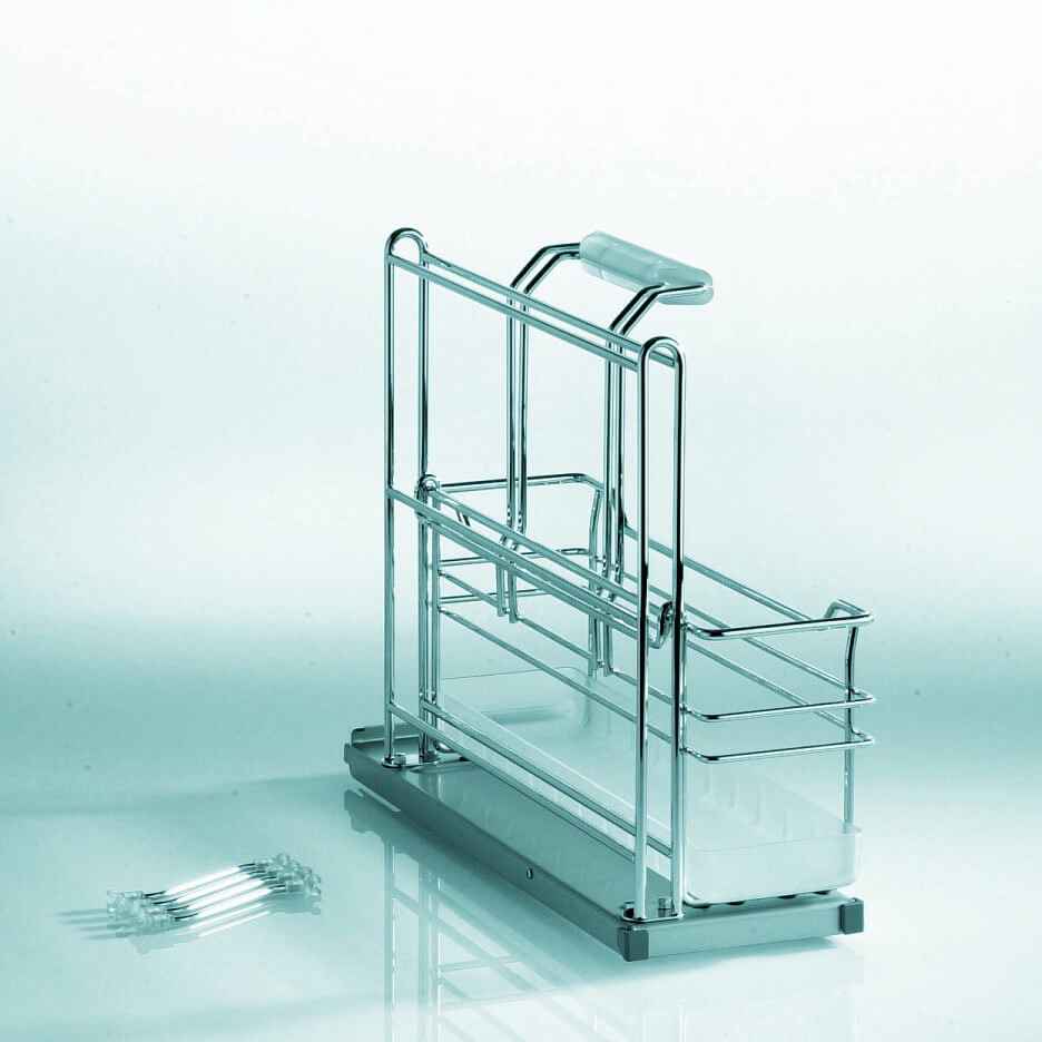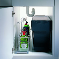 Контейнер "Портеро" для хозпренадлежностей оснащен одной выкатной съёмной ёмкостью с ручкой. Механизм оснащен системой Софт Стоп, обеспечивающей плавное задвигание в тумбу. Направляющие крепятся ко дну каркаса, что делает механизм универсальным. Габаритные размеры механизма Портеро: ширина 160 мм, глубина 468 мм, высота 395 мм. Дно выполнено из пластика стойкого к щелочам и кислотам. Нагрузка на механизм до 12 кг.