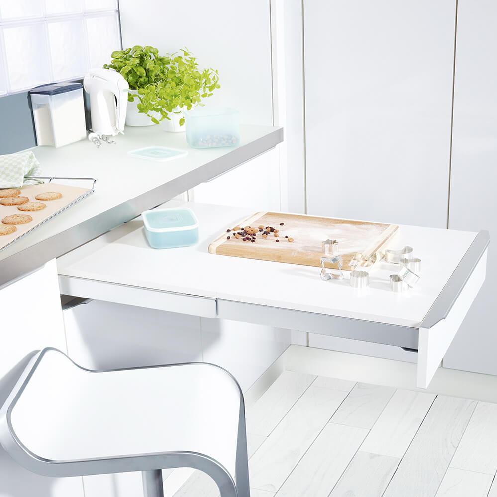 Топ Флекс 450 - 900 мм - выдвижной стол-телескоп. Телескопический столик полностью спрятан за фасадом и выдвигается тогда, когда он Вам нужен. Полностью вытянутый столик состоит из двух поверхностей, которые также быстро складываются, как и раскладываются. Идеальное решение для маленьких компактных кухонь. Значительно экономит места, сохраняя привычный комфорт. Подходит для тумб шириной 450 - 900 мм.