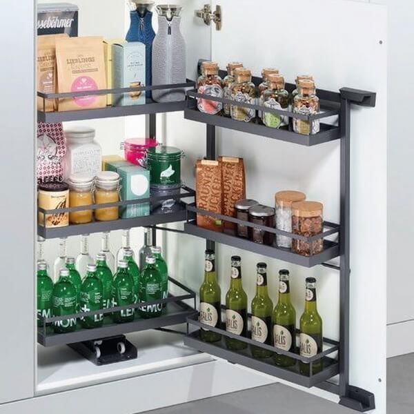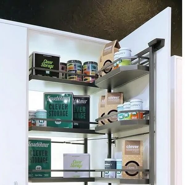 Тандем II - механизм для рационального хранения сухих продуктов в высоких и широких шкафах. Система представлена двумя частями: фасадной и внутренней. При открывании, фасадный модуль остается на фасаде, а внутренний модуль легко и плавно выдвигается на передний план. Такое решение выгодно разделяет пространство для хранения, обеспечивая легкий обзор и удобный доступ ко всему содержимому шкафа.