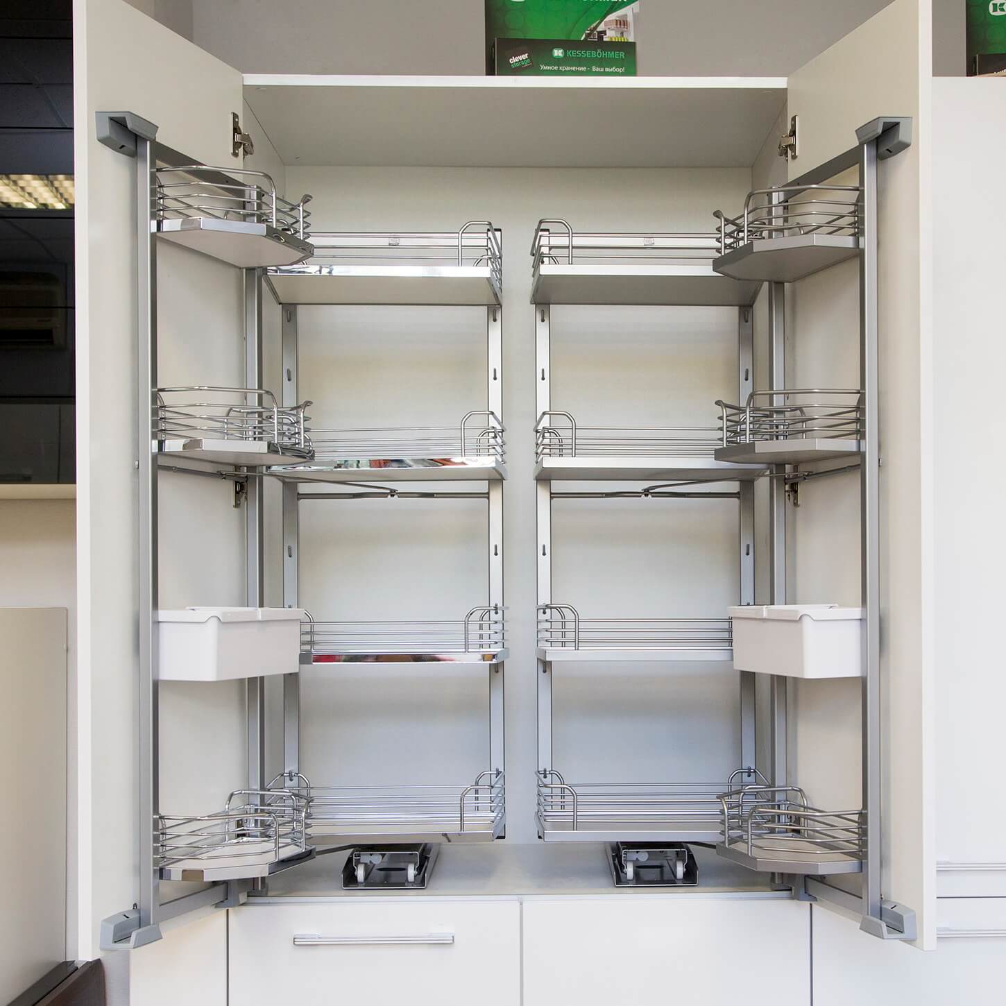 Тандем II - механизм для рационального хранения сухих продуктов в высоких и широких шкафах. Система представлена двумя частями: фасадной и внутренней. При открывании, фасадный модуль остается на фасаде, а внутренний модуль легко и плавно выдвигается на передний план. Такое решение выгодно разделяет пространство для хранения, обеспечивая легкий обзор и удобный доступ ко всему содержимому шкафа.